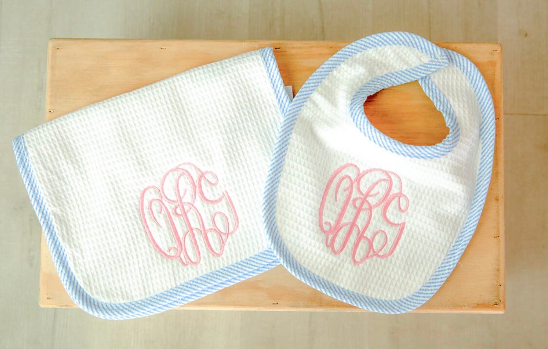 Original with classic seersucker trim...Our Seersucker Bib and Burp Cloth sets are sure to please. Made with a very soft, luxurious terry cloth back and detailed waffle cone fabric front. They make the perfect newborn set, baby shower gift or everyday classic to add to the baby’s collection. These seersucker bib and burp cloth sets are easy to add a name or monogram. The Details.... • This product comes with ONE (1) Bib and ONE (1) Burp Cloth • 100% Waffle Cone Front • Terry Cloth Back (extra absorbency) • 100% Stripe Cotton Seersucker Trim on each • Bib is recommended for sizes 0-6 Months.